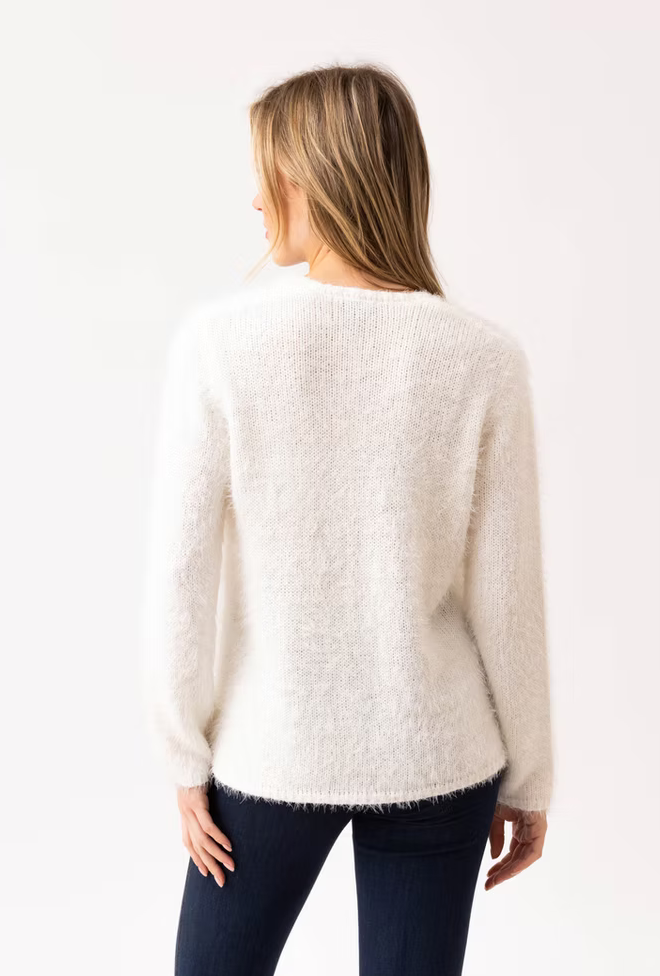 uper soft feather yarn relaxed fit v neck sweater with a gradient two colour knit pattern and a detachable snood
