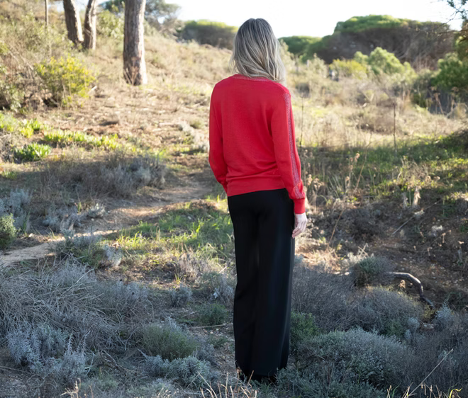 Super soft cotton mix with silver metallic finish v neck sweater with metallic finish stripe at sleeve, neckline and centre front of main body